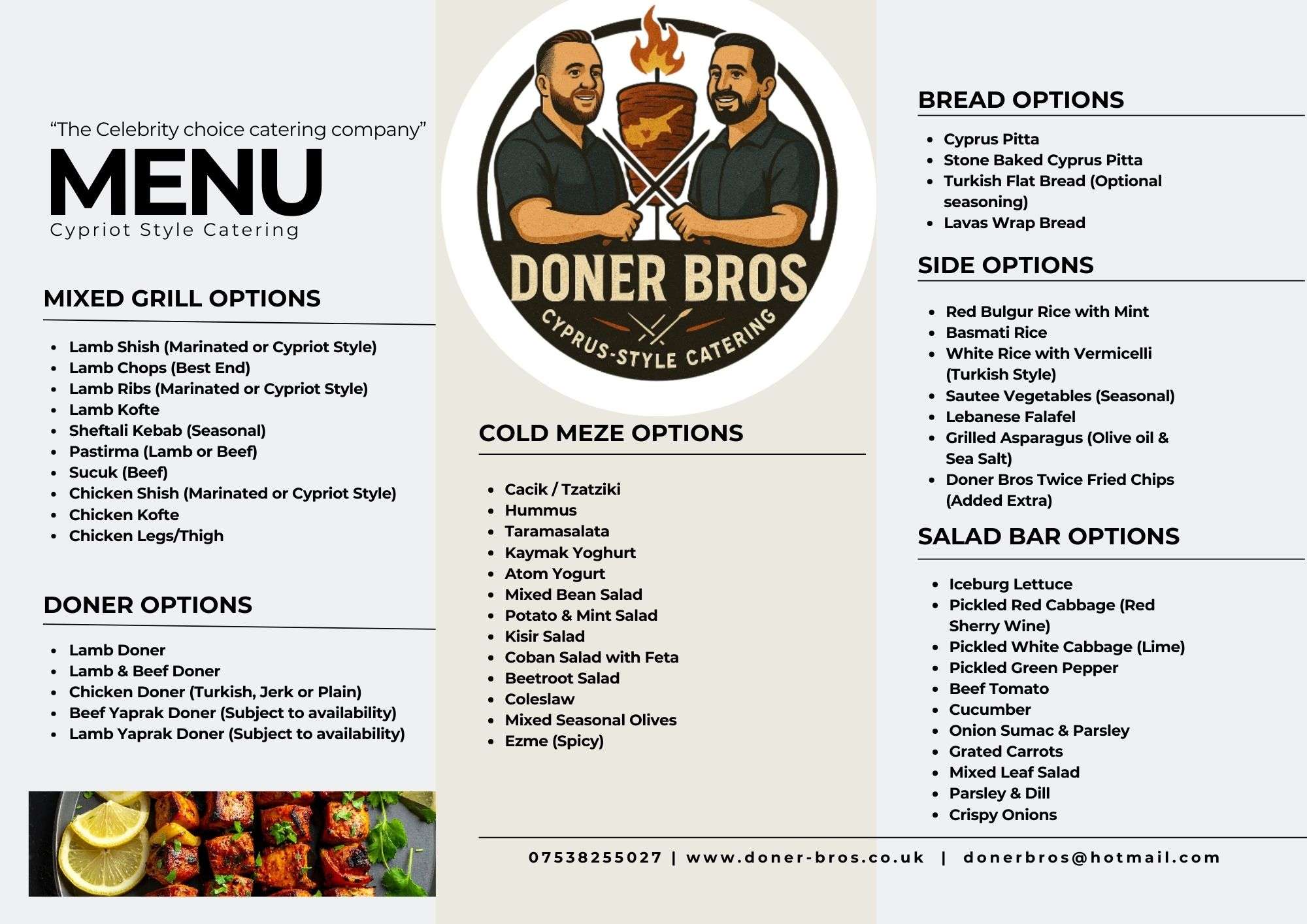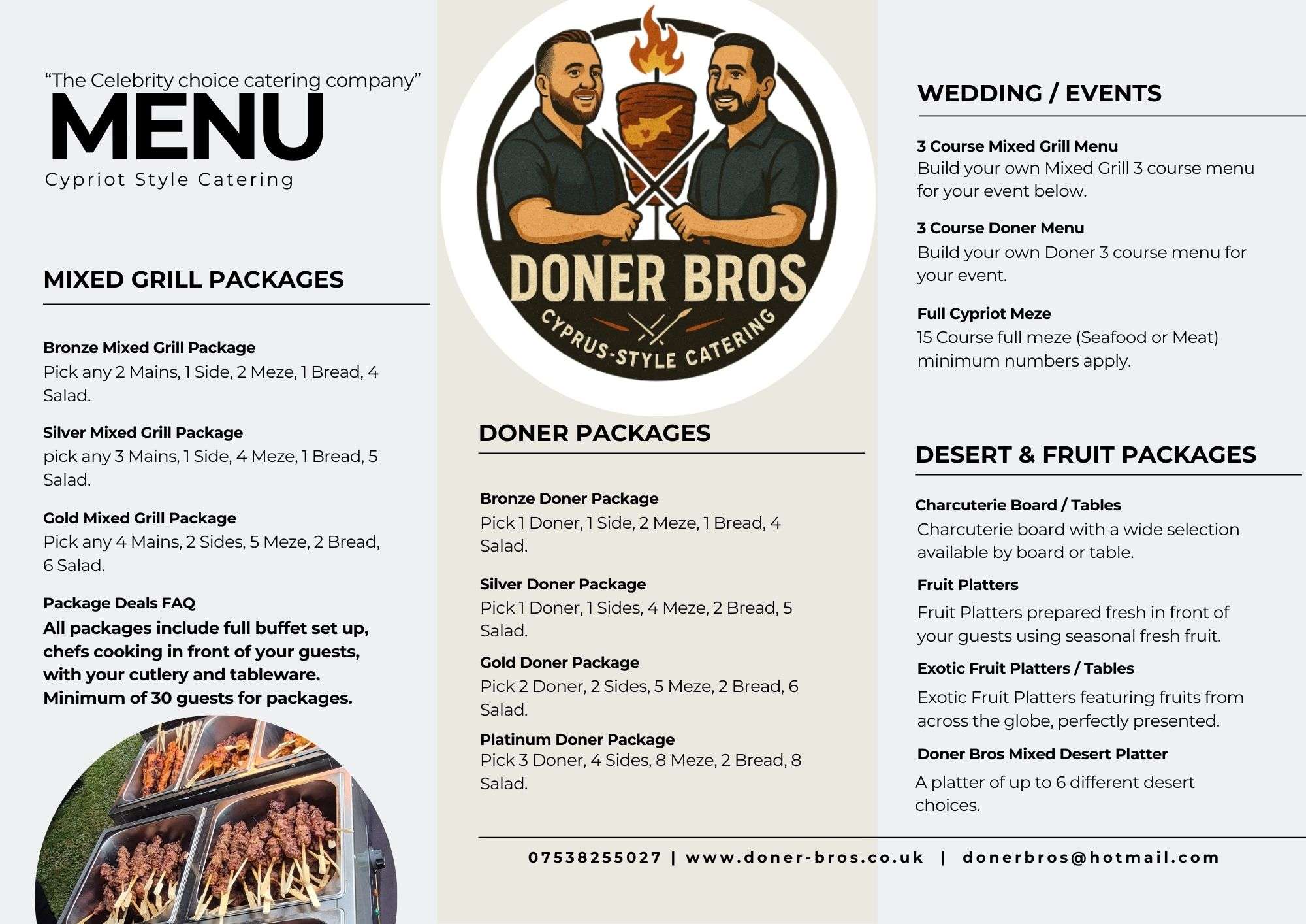 Download our exclusive 2026 menus for more on our package deals and options. Doner Bros are also pleased to offer tailored menus to suit your needs, contact us for more information and for all quotations.